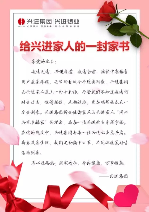 每份蔬菜都密封包裝,并采取無接觸式配送,確保每一份“心意”都能安全到家,希望這些蔬菜為業(yè)主的飯桌上添加一道美味。與愛心蔬菜一起送到業(yè)主手中還有一封家書,鼓舞人心的話語,所帶來的不僅是一份感動(dòng),更是一份力量。