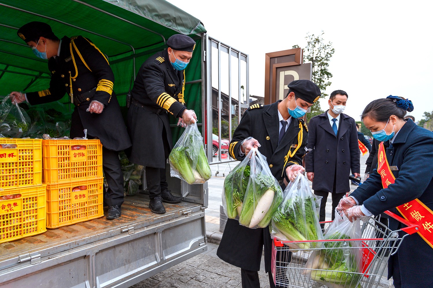 【穴田村泗林屯的菜農(nóng)們將采摘好的蔬菜送上愛心車】