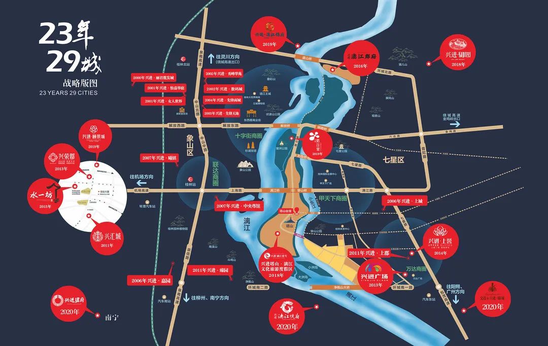 2011年,七星區(qū)首屈一指的經(jīng)典之作興進(jìn)·上郡的出現(xiàn),將坡地建筑設(shè)計(jì)理念引進(jìn)桂林;首入臨桂,以大型人文社區(qū)興匯城重塑新區(qū)人居格局。
