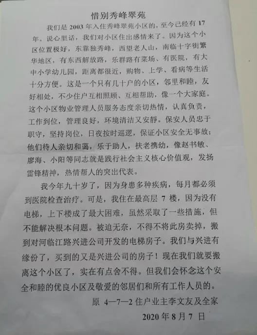 在搬離秀峰翠苑時,他曾寫下惜別秀峰翠苑的一篇文章,對秀峰翠苑的環(huán)境、配套、和睦社區(qū)、貼心物業(yè)贊不絕口。雖然搬離秀峰翠苑,但是老人和興進的緣分還在繼續(xù),新居銀桂府沒有讓老人失望,開篇我們所看到的就是老人對新居銀桂府的一切有感而發(fā)和高度贊揚。