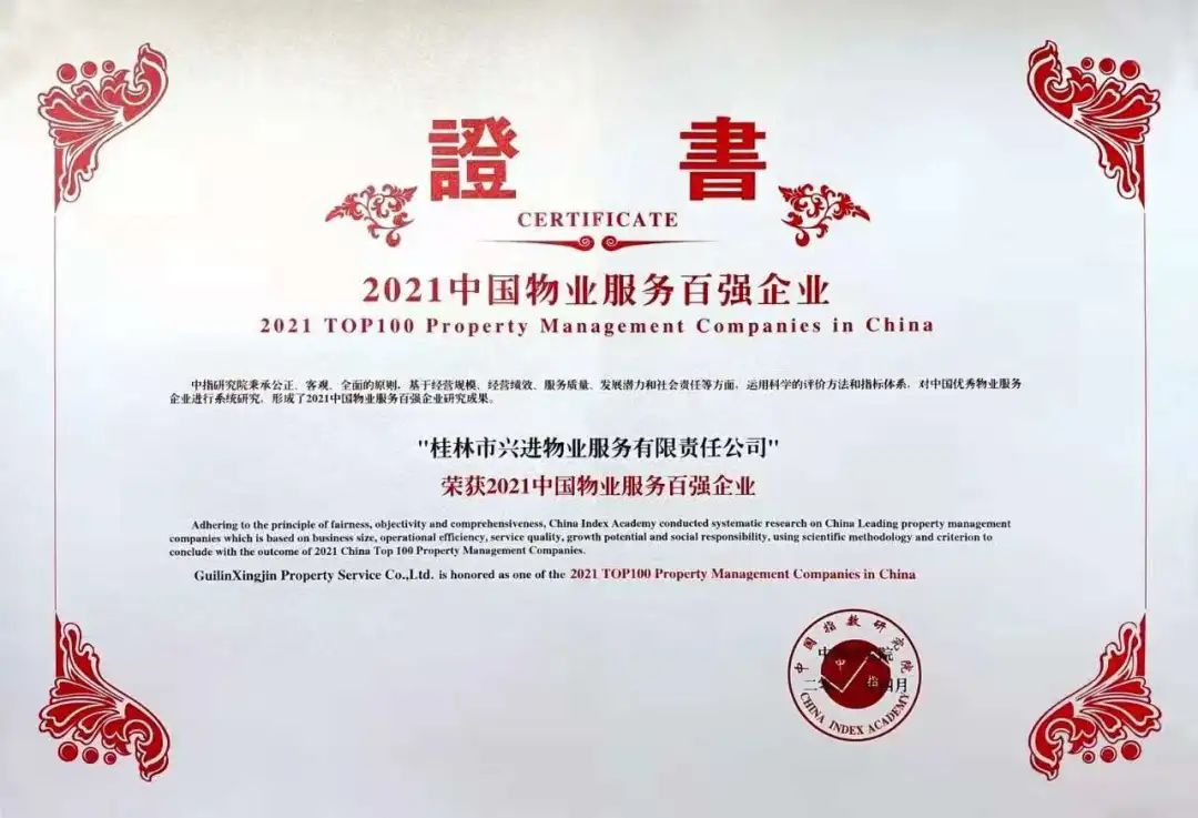 2021年,經(jīng)中指研究院、中國房地產(chǎn)TOP10研究組研究調(diào)查,興進(jìn)物業(yè)榮膺2021年年度中國物業(yè)服務(wù)百強(qiáng)企業(yè)第85位,是桂林市2021年度唯一登榜企業(yè)。自2001年成立以來,興進(jìn)物業(yè)憑借一整套與眾不同的管理制度與服務(wù)標(biāo)準(zhǔn),贏得業(yè)主的支持與信賴,屢獲業(yè)界殊榮。