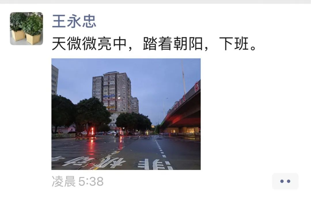 "天微微亮中,踏著朝陽,下班。"