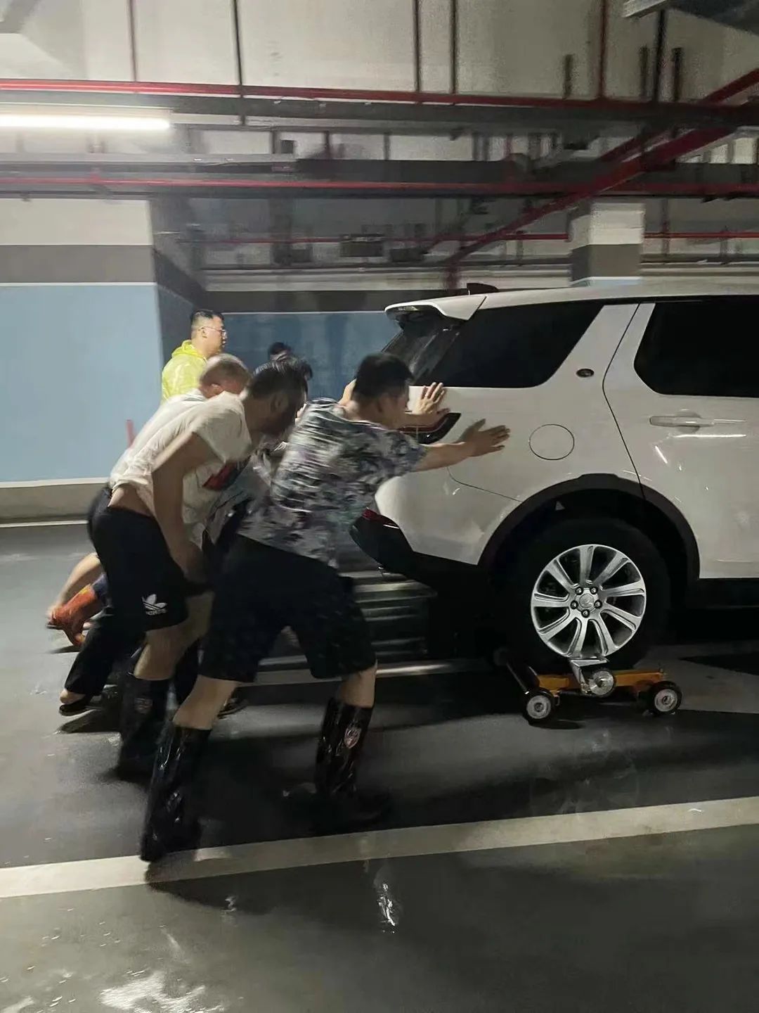 面對即將到來的汛情,物業(yè)人員第一時間拉起了警戒線,引導業(yè)主車輛進出。眼見著水位越來越深,雨越下越大,全員集體行動,協(xié)助車主移車。有的車主聯(lián)系不上,物業(yè)團隊便果斷冒雨采用移車器移車,從下午一直忙碌到晚上九點多,成功將所有車輛轉移至安全區(qū)域,力保業(yè)主們的愛車不受損失。