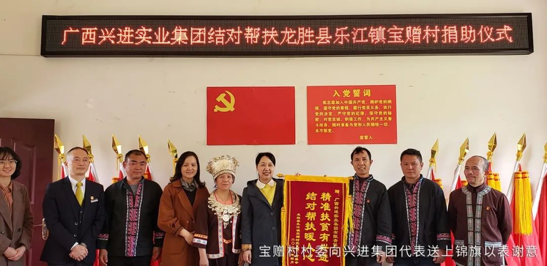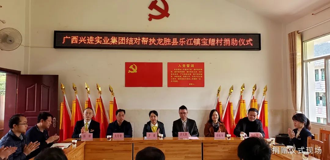 龍勝縣委常委、組織部部長李文濤,縣人民政府副縣長龍憲智,樂江鎮(zhèn)黨委書記陽慶國,寶贈(zèng)村駐村第一書記周龍武,寶贈(zèng)村黨支部書記黃先章,興進(jìn)集團(tuán)黨支部書記、副總裁羅捷,興進(jìn)集團(tuán)黨支部組織委員、人力行政中心總經(jīng)理助理李桂華及黨支部宣傳委員、物業(yè)公司人力行政總監(jiān)陳健參與捐贈(zèng)儀式。