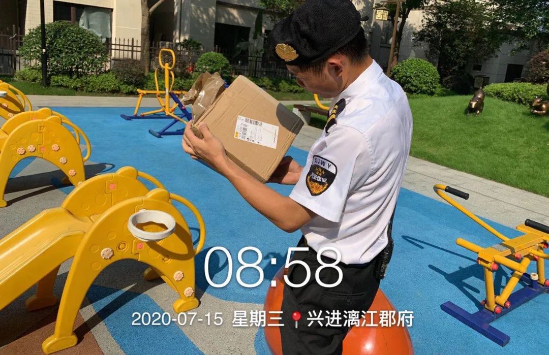 興進·漓江郡府銀桂府秩序員楊強,在日常的巡邏時,發(fā)現(xiàn)有一件快遞被遺漏在兒童游樂區(qū)。根據(jù)快遞上的地址與聯(lián)系方式,楊強立馬前往業(yè)主家中送還快遞。