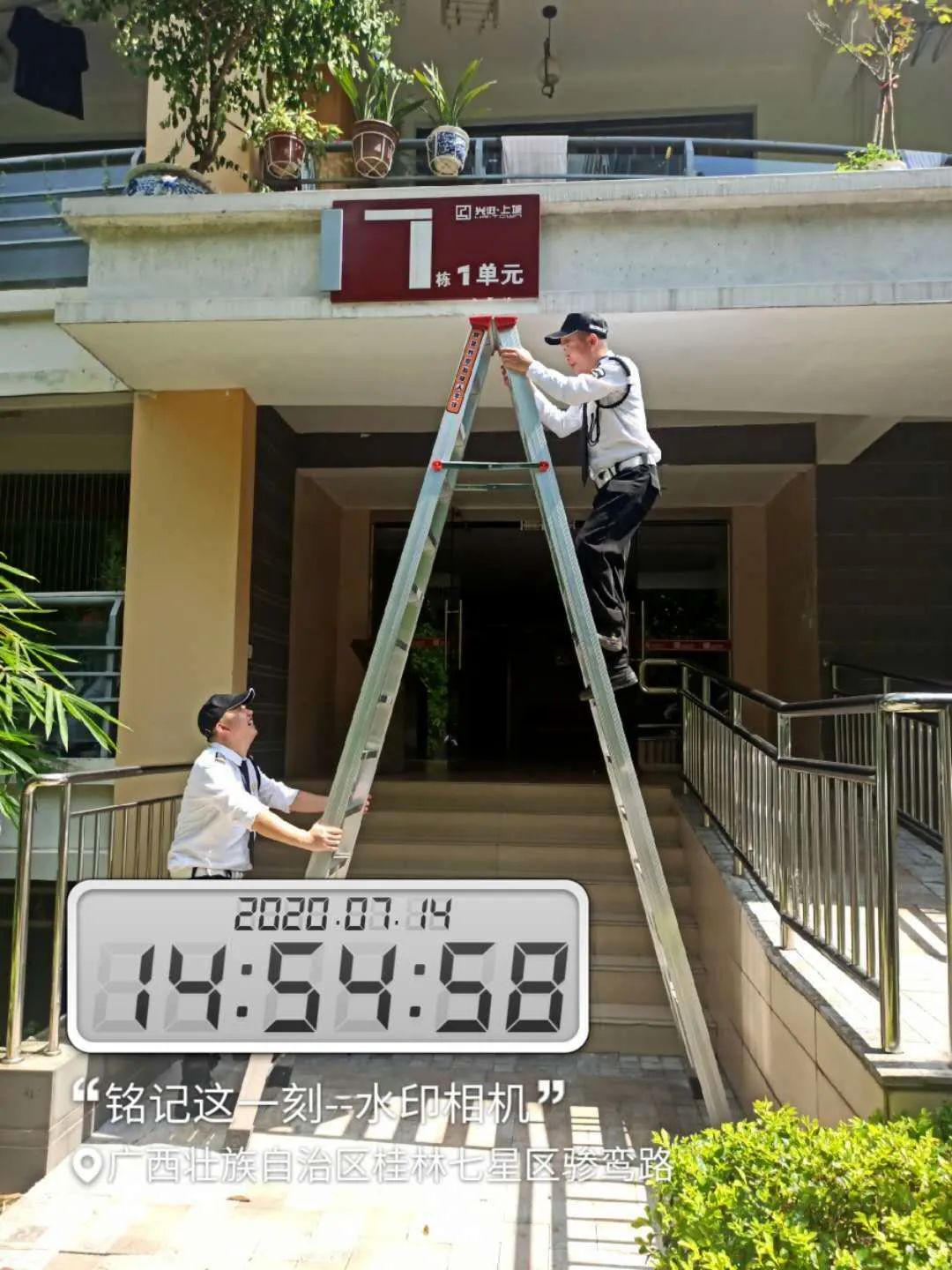 物業(yè)服務中心立馬聯(lián)系秩序班長陽榮江,接到通知后,陽榮江立即趕往現(xiàn)場。午后的陽光格外刺眼灼熱,陽榮江頂著驕陽從一樓順著工具梯爬到二樓,從業(yè)主家陽臺進入房間取出房門鑰匙。